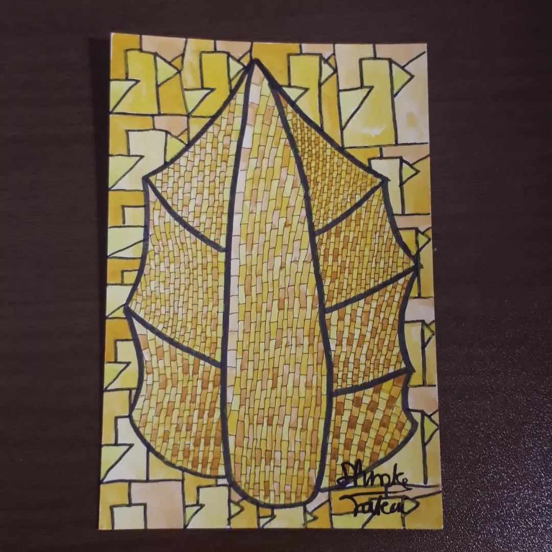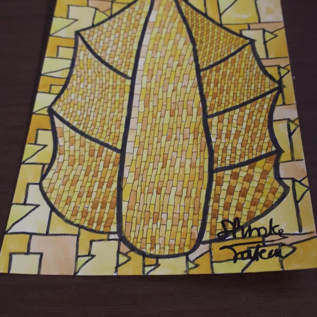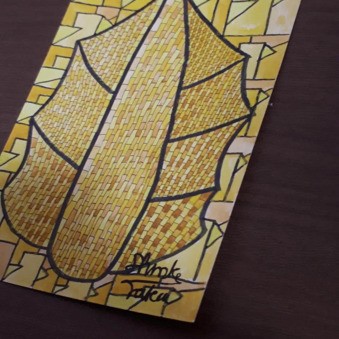 ウバメガシの葉をモチーフに細密に葉脈を色づけし、背景には小説を読み、抽象化してそれを敷き詰めています。