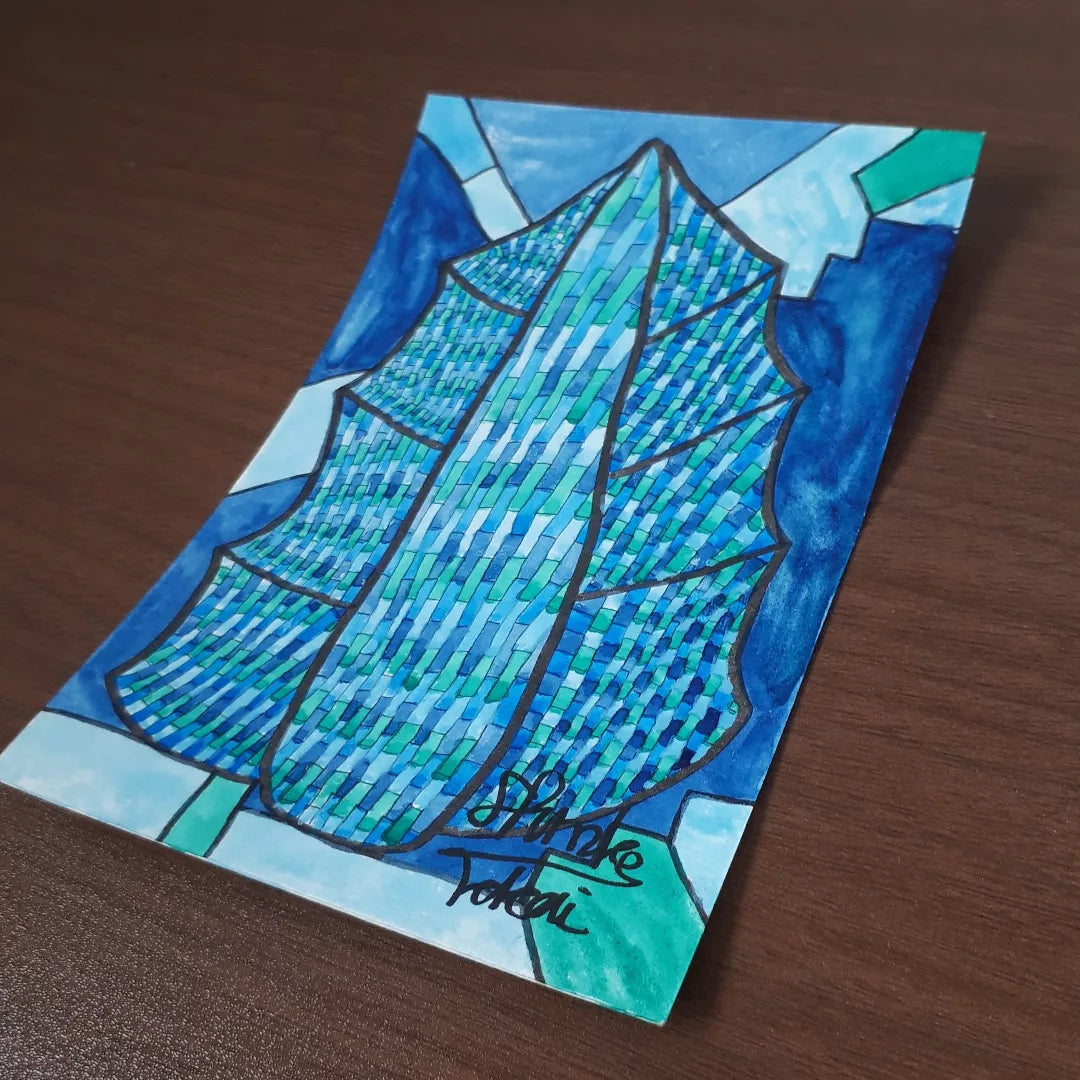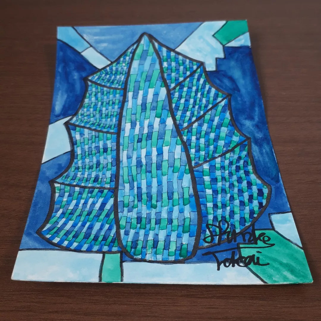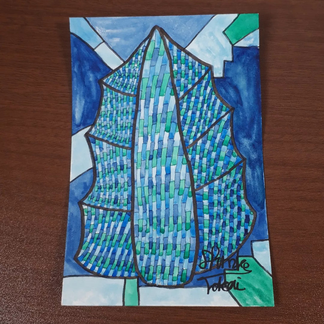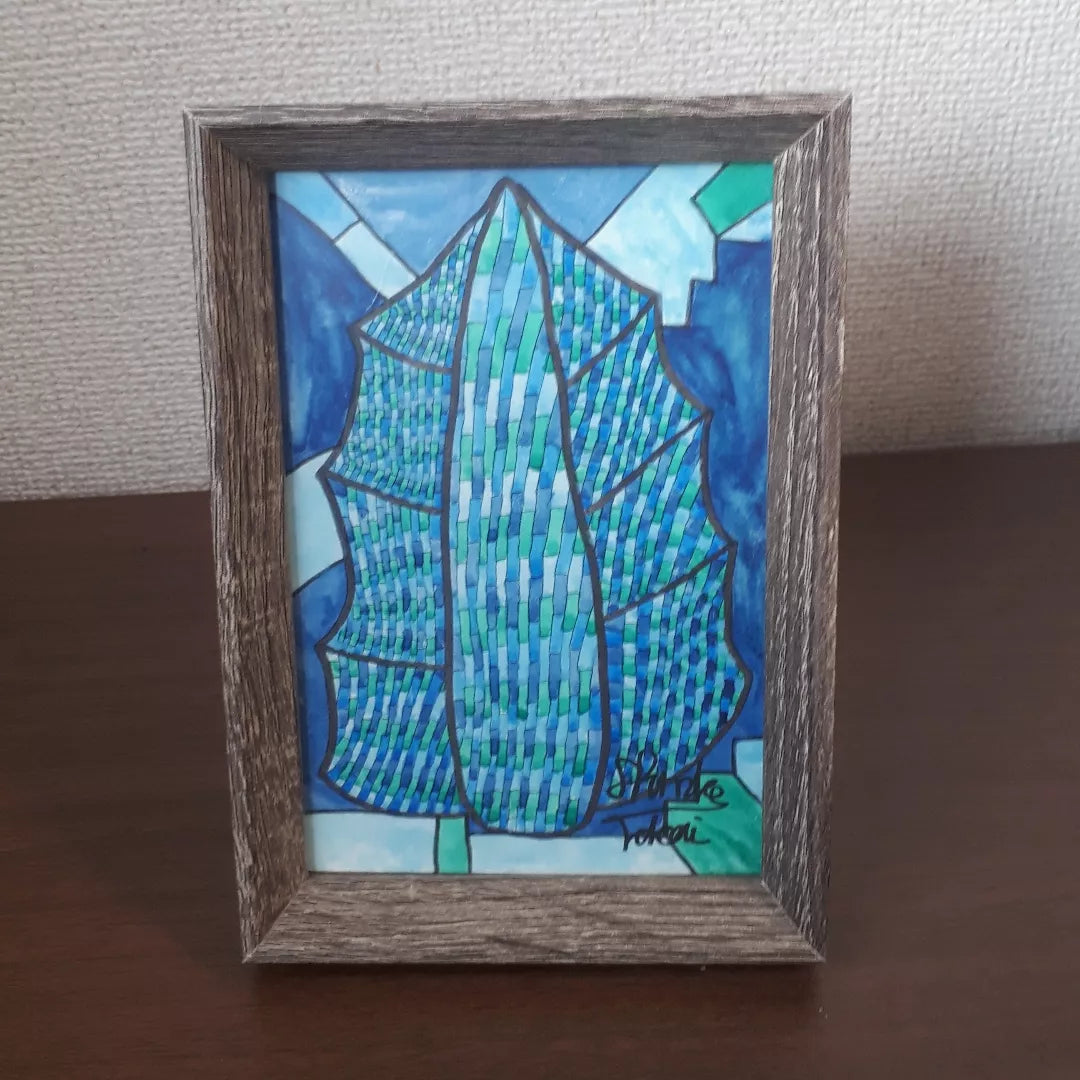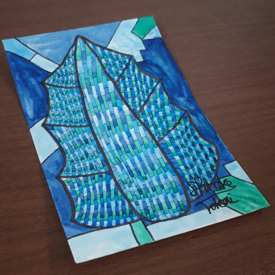 ウバメガシの葉をモチーフに細密に葉脈を色づけし、背景には小説を読み、抽象化してそれを敷き詰めています。